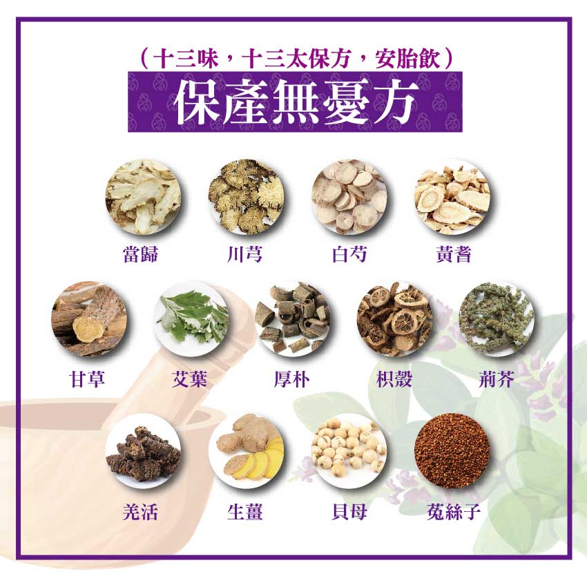 這時患者常常去藥店調配保產無憂方(十三味,十三太保方,安胎飲),其成分為厚朴(薑汁炒)、蘄艾葉(醋炒)各七分,當歸(酒炒)、川芎各一錢五分,生黃耆、荊芥穗各八分,川貝母(去心凈,為末,不入煎,以藥沖服)、菟絲子(揀凈,酒泡)各一錢,川羌活、生甘草各五分,枳殼(麩炒)六分,白芍(酒炒)二錢(冬月只用一錢)藥須照方揀選炮製後,用量稱準,不可加減分毫,引用老生薑三片,水二大鐘,煎至八分服,預服者空心溫服。臨產及胎動不安並勢欲小產者,皆臨時熱服。