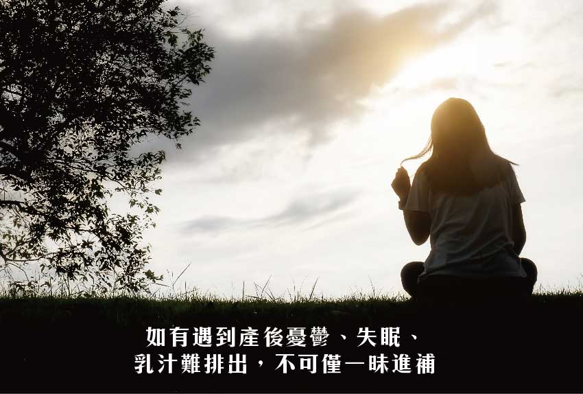 在進行上述三個時期調養的同時,也要注意是否有肝氣鬱結的情況,若肝氣鬱結則可能會出現所謂的產後憂鬱、失眠、或是明明有乳汁卻難以排出、進而阻塞發炎的鬱而化火情況。新生命的誕生是件喜悅的事情,然而對於產婦的身體及生活都會出現很大的變動,可能一時難以適應,便可能會造成情緒上波動,也就是肝氣失調,若不處理這部分僅一味進補,不但功效折扣,還可能火上加油,使得媽媽們出現煩躁、便祕等火氣大的情形。
