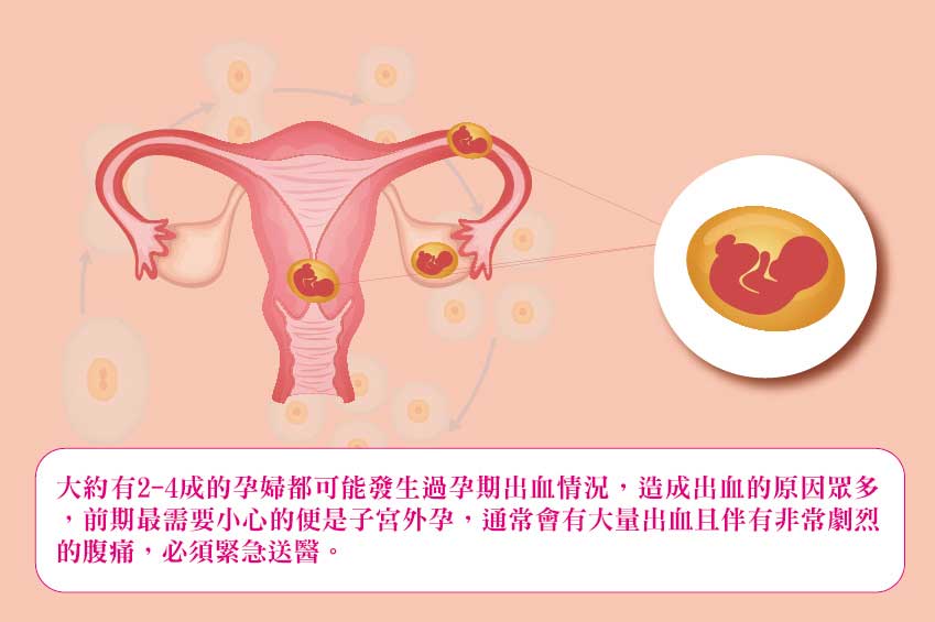 請準媽咪們先別緊張,大約有2-4成的孕婦都可能發生過孕期出血情況,造成出血的原因眾多,前期最需要小心的便是子宮外孕,通常會有大量出血且伴有非常劇烈的腹痛,必須緊急送醫,而一般常見的則是懷孕前期的著床不穩定出血,西醫會先給予黃體素安胎,然而有些孕婦吃了黃體素或是打安胎針後會有噁心的副作用,或仍有出血不止的情形,便會轉往中醫尋求協助。