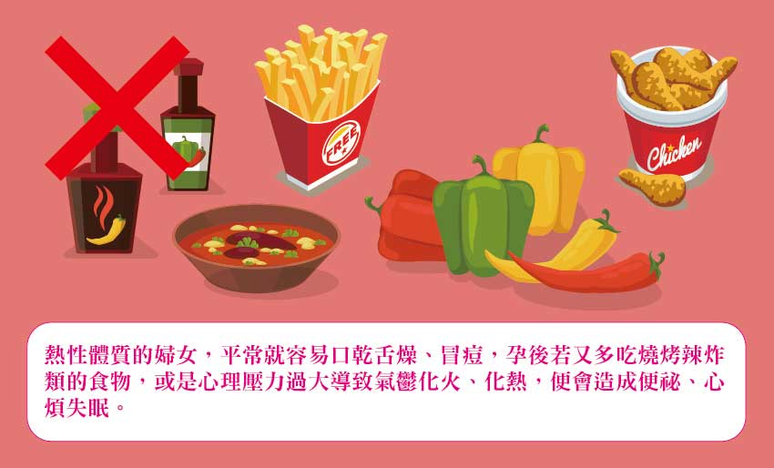 而血熱則多出現在原本就是熱性體質的婦女,平常就容易口乾舌燥、冒痘,孕後若又多吃燒烤辣炸類的食物,或是心理壓力過大導致氣鬱化火、化熱,便會造成便祕、心煩失眠,以及熱迫血行,這類型的出血量可能會較氣血虛弱型多,顏色也會較為鮮紅,血熱型的孕婦千萬不能再進補過多溫熱之品,以免火上加油,使得胎動更為不安。