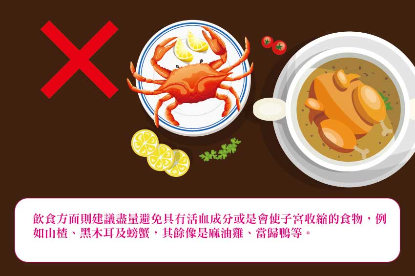 飲食方面則建議盡量避免具有活血成分或是會使子宮收縮的食物,例如山楂、黑木耳及螃蟹,其餘像是麻油雞、當歸鴨等食補也請暫停食用,以防過於燥熱而使動血、下血。懷孕期間最重要的是保持平穩的情緒,以及勿過度勞累,若發現出血量持續增加,或是同時伴隨腹痛,別只是臥床休息而已,一定要前往中醫或西醫醫療院所做進一步的檢查才行。