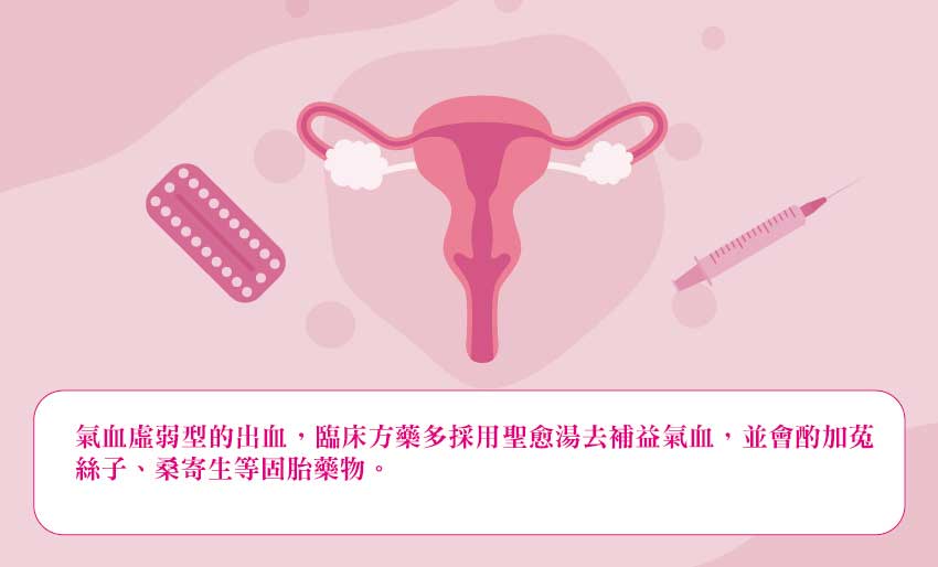 中醫將孕期裡的出血稱為「胎漏」、「妊娠下血」或是「胎動不安」,引發的原因可能為氣血虛弱或是血熱。氣血虛弱通常是出現在工作較為勞累或是食慾不佳的婦女,氣無法固攝住血而使血下漏,這類型通常出血量不多,多呈淡粉紅色,其面色通常蒼白無血色,容易疲勞,甚至會伴隨些微腰痠或是腹部下墜的感覺,這類型的要較為小心,需要立即滋補氣血並多休息,也要停止搬重物或是四處奔波,以免進而演變成流產。
