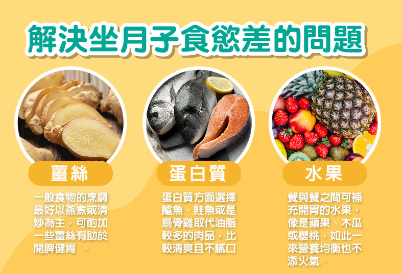 月子期間若想解決食慾差的問題,周宗翰說明,一般食物的烹調最好以蒸煮或清炒為主,可酌加一些薑絲有助於開脾健胃;蛋白質方面選擇鱸魚、鮭魚或是烏骨雞取代油脂較多的肉品,比較清爽且不膩口,餐與餐中間可補充開胃的水果,像是蘋果、木瓜或櫻桃,如此一來營養均衡也不添火氣。