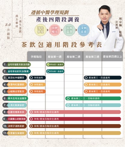 我們的顧問周宗翰中醫師已經幫大家規劃好「產後飲用指南」,孕期和產後各階段適合飲用的茶燉包都在上面啦!(趕快把圖片存下來照著喝!)