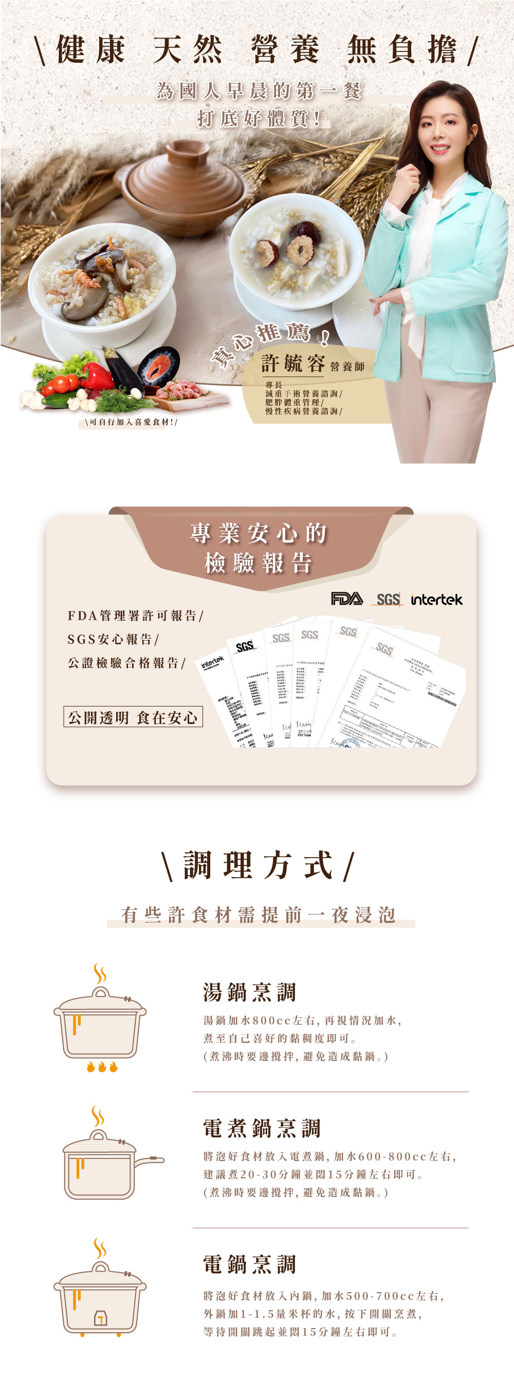 ■ 食用方法: 每份粥品為1人份,建議水量600c.c~800c.c.,建議小火慢煮20-30分鐘。 (煮沸時要邊攪拌,避免造成黏鍋)
